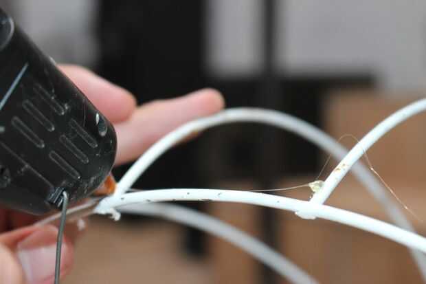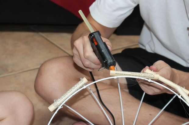 Utilice la pistola de pegamento para aplicar pequeñas gotas de pegamento al marco y colocar un rollo sobre estas gotas (trabajar con rapidez, el pegamento se seca muy rápido).