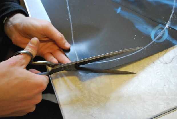 Ahora que tienes todos los pedazos cosidos juntos, es tiempo para cortar la forma general. Comience trazando la vieja lámpara sombra la plantilla en las radiografías con tiza. Recomiendo usar tiza porque es muy fácil de lavar y no deje una marca en la pantalla final.