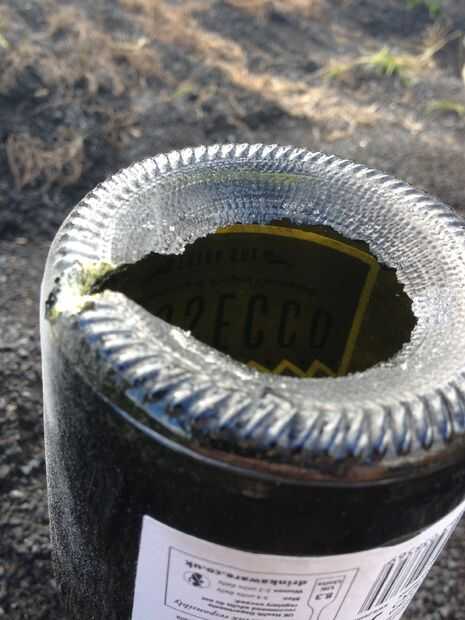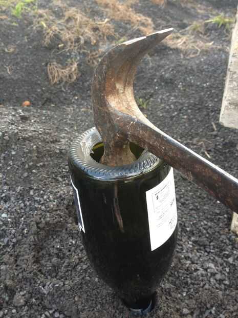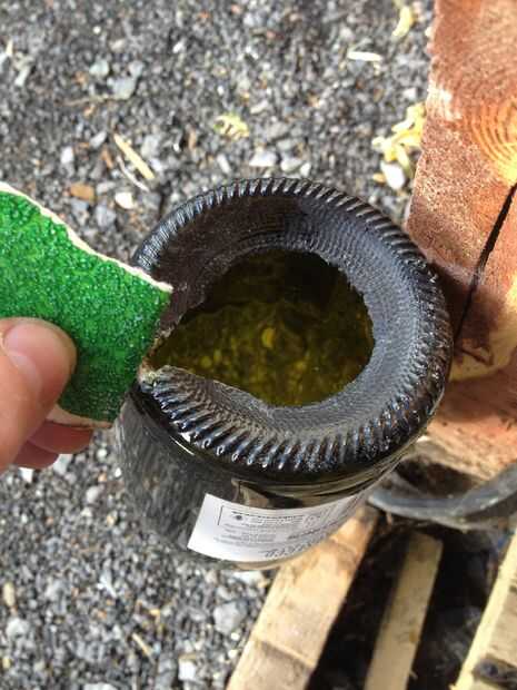 Una vez que depende de tus minutos, soplar la llama y verter el líquido en el pozo y vuelva a colocar la grava. Y con gafas etc. en su lugar dar la base del pozo un grifo de confianza con un martillo y se soltará sin esfuerzo. Luego golpee ligeramente el tamaño de una candelita y un surco en el borde para permitir suficiente oxígeno entrar en la botella para la candelita para continuar ardiendo. Dar el vidrio una frotación suave con papel de lija para opacar el borde, sin embargo también se puede utilizar Sugru.