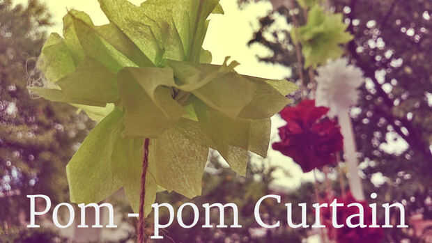 aquí es mi cortina de la puerta de la cocina. He hecho de un pedazo de tela vintage de que mi tía abuela me dio. Es 93 y no puede recordar cuando ella compró, pero encanta iI. He añadido una cabecera moña con pompones.