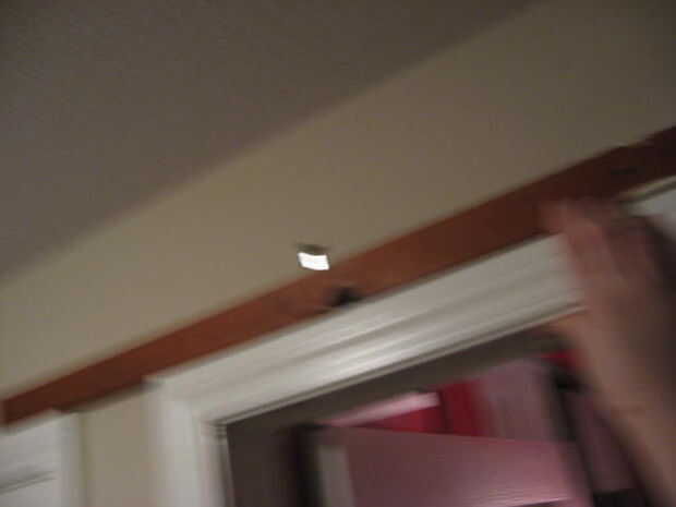 Medir la duela de madera en la parte superior de la puerta. Tuve que recortar mi, y ya que estamos en la edad oscura de las herramientas que tuve que usar un cuchillo de bistec filo. Si esto se aplica también a usted, tenga cuidado de no quedar atrapados o de lo contrario se obtendrá en un montón de problemas!!!! Quería pintar mi madera, pero no tiene tiempo: ()