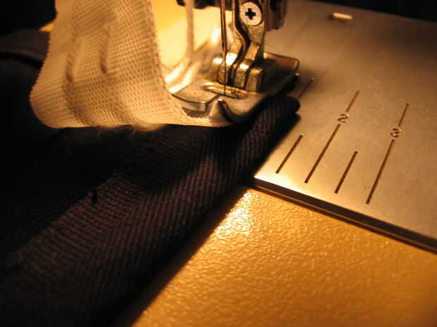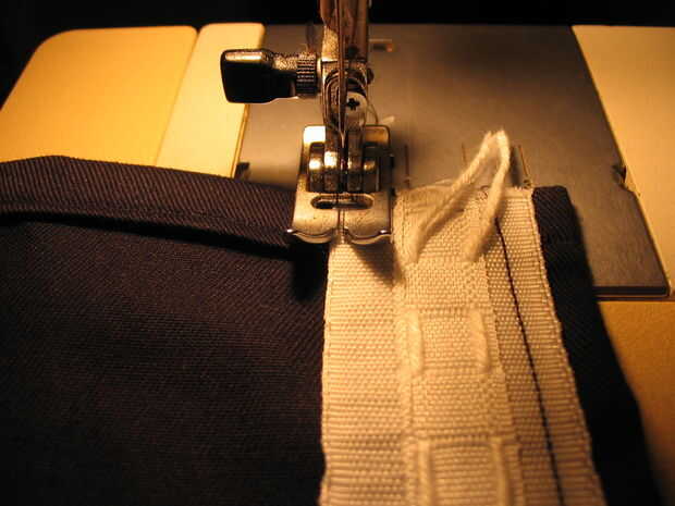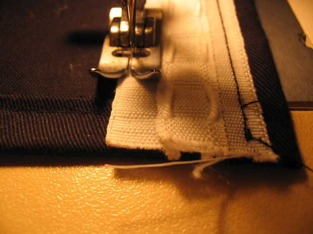 Cosa lentamente, asegurándose de que la alimentación en la cinta de la recta, mantener el pliegue en la tela el ancho adecuado y la aguja en el lugar correcto. No es especialmente fácil, pero he podido evitar hacer un tonto de mí mismo. Atrás hacia adelante y hacia atrás un par de veces al principio, y otra vez al llegar al final - como último paso discutido.