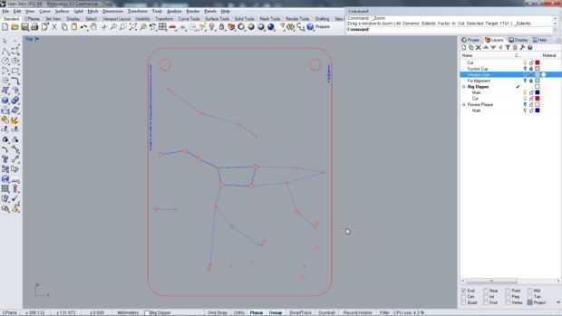 Para preparar el diseño utilicé Rhino 5, pero básicamente haremos cualquier programa de dibujo vectorial. Las cortinas son unos 20 mm menos alto que las gafas. De esa manera se puede fácilmente poner en los ganchos. Para mantener el laser de aburrimiento, he añadido algunas ilustraciones para las piezas principales: