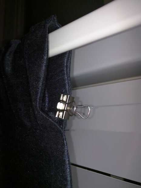 Para sujetar las cortinas, tomé algunos clips de carpeta y acortado a las cortinas, después de ver los clips donde con a la línea, ligan los a lados opuestos de la línea, para que vayan en direcciones opuestas.