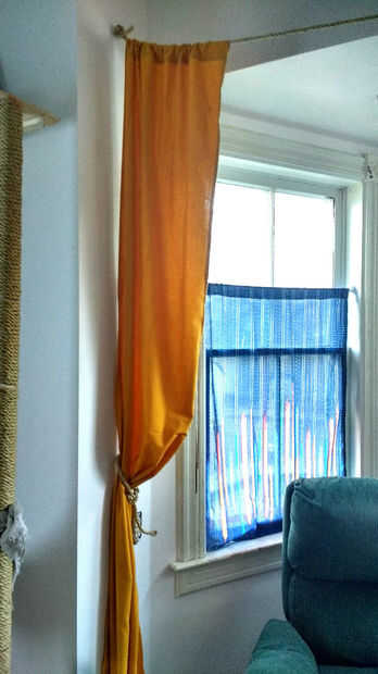 Originalmente pensé que utilizaría el mantel amarillo oro en las ventanas de la bahía--como un respaldo a las cortinas de azul o la cortina media (en vez de la cortina azul). Sin embargo, decidí que quería una entrada de aspecto más elegante a la ventana de la bahía zona--sin mencionar que tenía todas mis cortinas en el living y comedor, colgando de la cuerda del sisal, así que hice lo que usted ve aquí de estar (lo que en la cuerda de sisal a través del resto de la habitación).