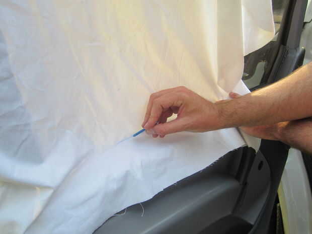 Sostener grandes trozos de tela a las ventanas y su ayudante para apoyar las piezas mientras marcan los bordes. La foto adjuntada muestra cómo utilicé los contornos de los paneles del cuerpo para definir el borde de las cortinas. Marcar las cortinas todo el camino alrededor.