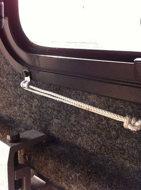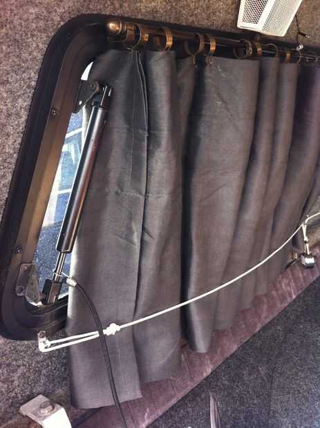 3 utilizando soportes de alambre pequeño (atornillados en el borde inferior de la wingdoor mediante tornillos de fábrica) colocados en el extremo y otra en el centro de la ventana, he conseguido un método para sostener las cortinas más cerca a la ventana, dando así más espacio en la furgoneta camper: atar un trozo de hilo (ligeramente más largo que la longitud de ventana) para los soportes de alambre en cada extremo y una junta tórica metálica para el soporte de alambre del centro de la abrazadera. Tire un lazo en el centro de la cuerda en la junta tórica y atar el peso (yo usé un combo-bloqueo en caso de que alguna vez lo necesito) en dicho lazo. Ahora, simplemente meta sus cortinas bajo la cuerda cuando quieren privacidad en su camper!