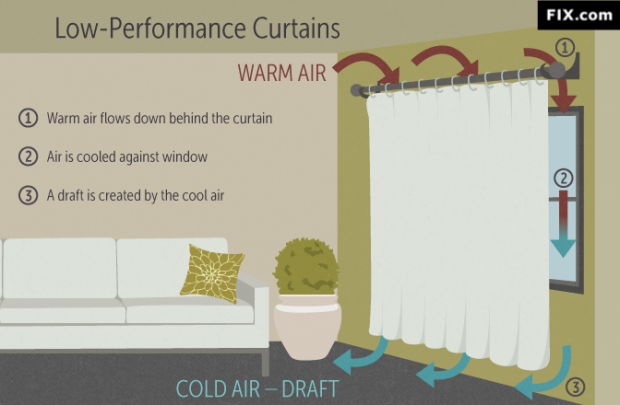 La ilustración anterior muestra este problema. Una cortina de libre-que cuelga, que se destapa, creará un canal de aire caliente ser enfriado contra la ventana. Como se refresca, es radiación de calor por la ventana y el aire frío se hunde en el suelo. El aire descendente crea presión negativa (vacío), tirando aire caliente desde el techo para llenar el vacío en el canal. Ahora es una corriente de aire frío.