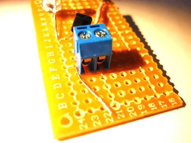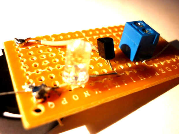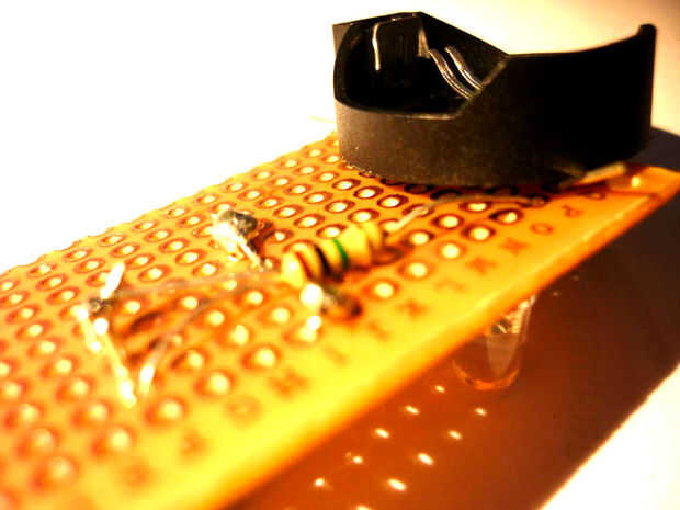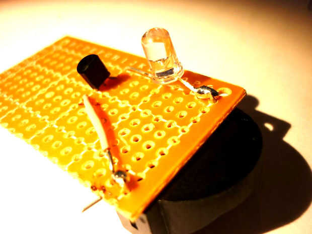 Poner el transistor con el semicírculo hacia fuera salas al lado del cable. soldar en su lugar, entonces lugar un led, con el lado positivo hacia el transistor positivo para el transistor y el lado negativo al titular de la masa de la soldadura.