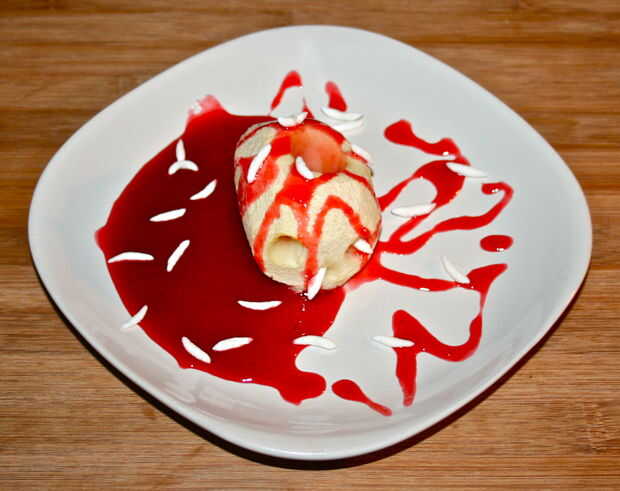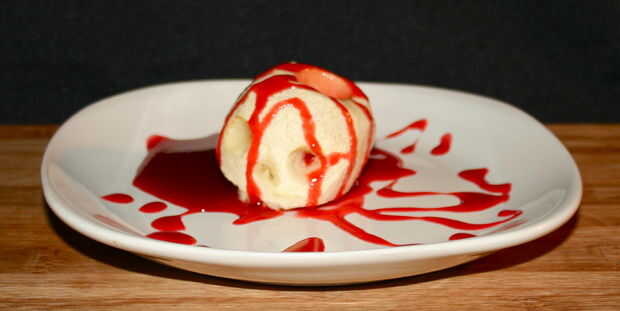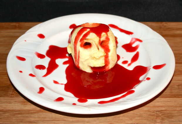 Una vez haya hecho sus manzanas al horno en sus placas de sangre, tomar la sangre restante de salsa y rociar sobre ellos. Si se ha cortado la boca o los agujeros del ojo lo suficientemente profundos como para llegar a la base del hueco, tratan de verter la salsa en el agujero y dejar gotear hacia fuera de los orificios ha labrado.