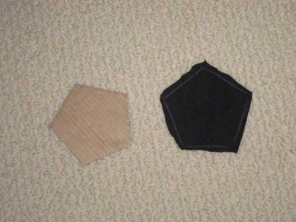 Ahora para cortar pentágonos. Utilizando a la guía de cartón, dibuja un Pentágono en la tela negra. Cortar una pulgada 1/8 extra alrededor de la frontera para crear una pequeña sala de meneo al montar. Si eres inexperto con una máquina de coser como yo, puede dejar un poco más de material alrededor de la frontera y recortar más tarde. Como un comienzo, cortar pentágonos unos 18.