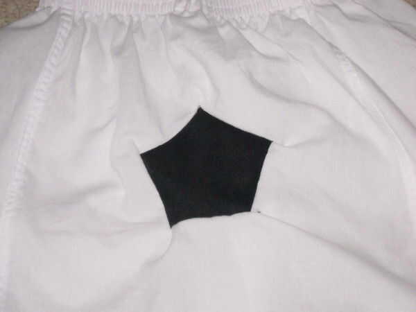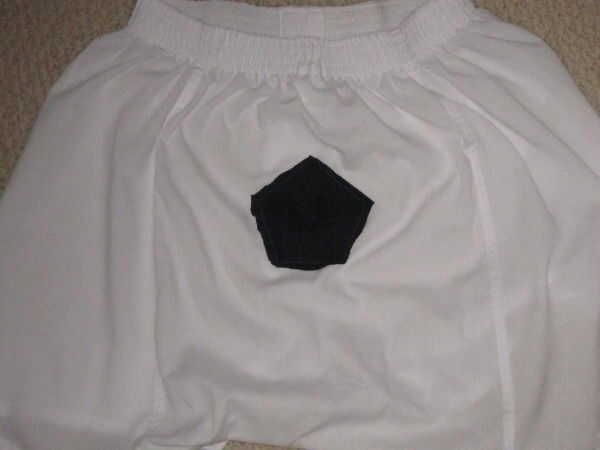 Elegir cualquier lugar de los cortos para unir el primer Pentágono con la primera costura horizontal. Esta costura se alinee con el borde de mismo nombre en la plantilla. Coloque el borde extra de 1/8 de pulgada del Pentágono de un tejido a lo largo de esa costura deseada. Una vez más, esto no necesita ser exacto. Para facilitar la costura (al menos para mí), primero el Pentágono en el lugar de la cinta y coser los bordes recto hacia los cortos. O usted puede pegar el Pentágono en el lugar.
