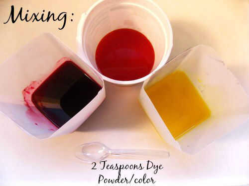 Colóquese la mascarilla! Mezcle 2 cucharaditas de colorante en polvo con aproximadamente 1 cucharada de agua tibia en un recipiente de mezcla. Revolver bien para disolver y después agregar 8 onzas de agua.