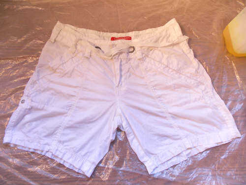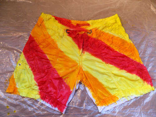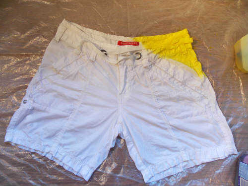 Nota: Si no desea que la pintura a sangrar a través de la parte delantera a la parte trasera de los pantalones cortos, coloque un trozo de cartón dentro. Ya que estoy haciendo el mismo diseño en ambos lados, me salté esta parte. Usando los pinceles de esponja, pintar los colores en un diseño de su elección. Rayas... causa me gusta rayas