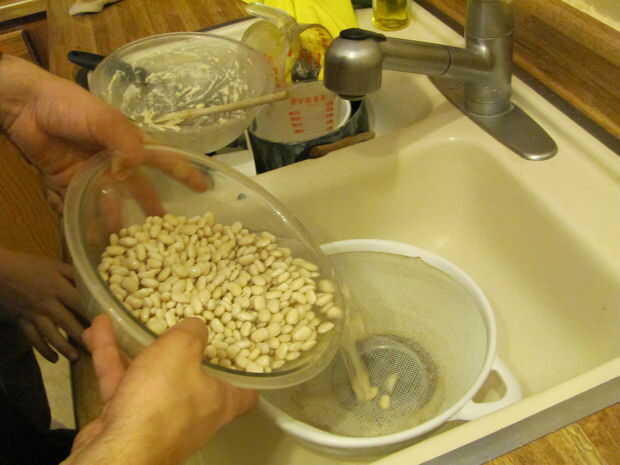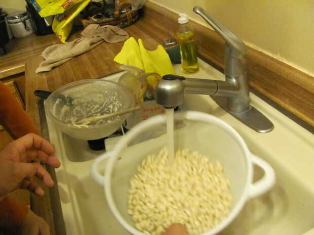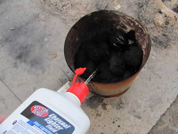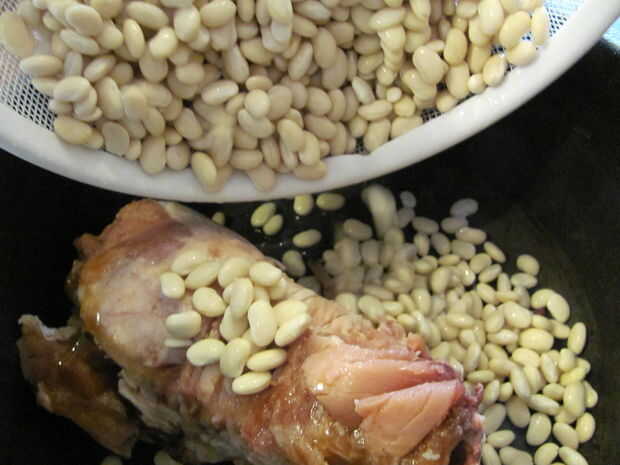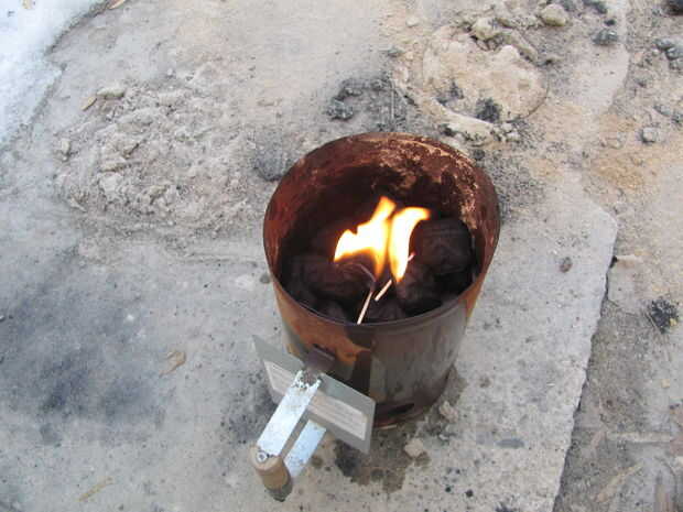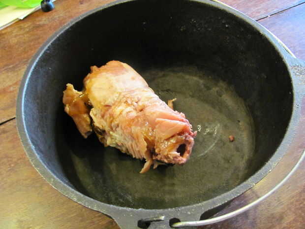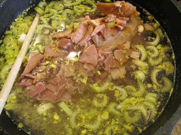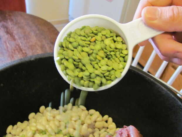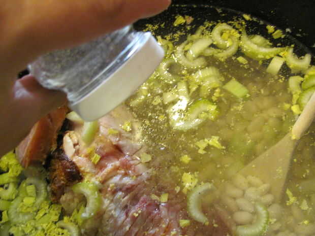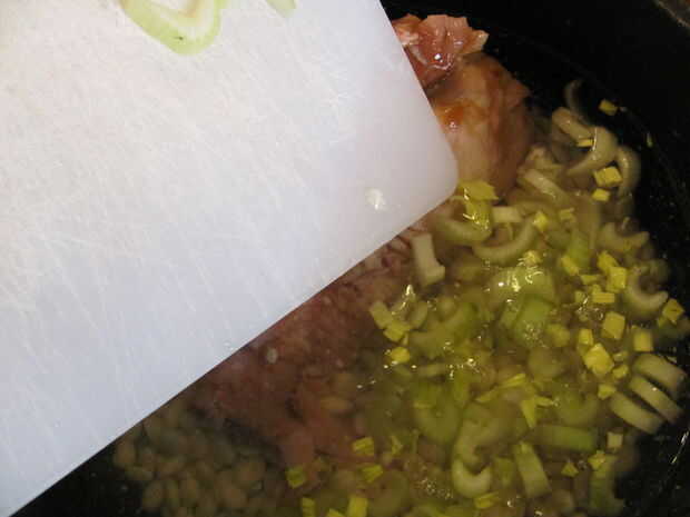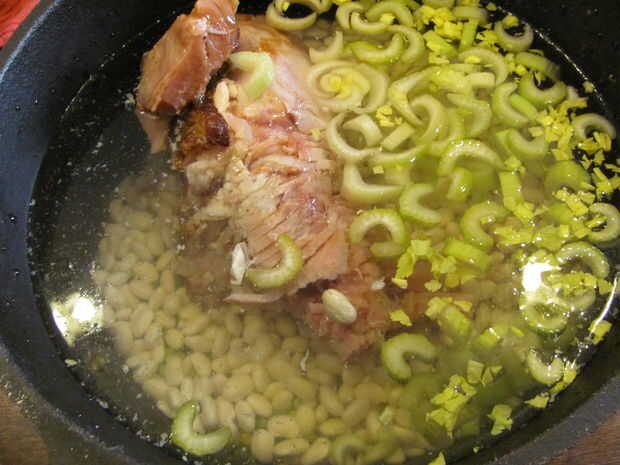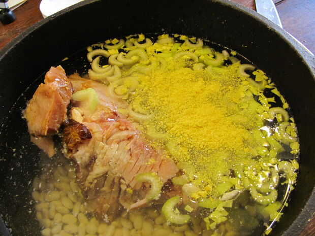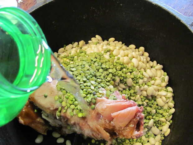 Light the charcoal. Para encender carbón de leña, o llenar una chimenea medio completo y empapar en el líquido más ligero, cayendo en un fósforo encendido, o construir una pequeña pirámide de carbón, sumerja en líquido para encendedores y luz los bordes, procurando todos lados luz. Poner el corvejón de jamón, judías, guisantes, jamón, apio, agua y especias en el horno holandés de 12".