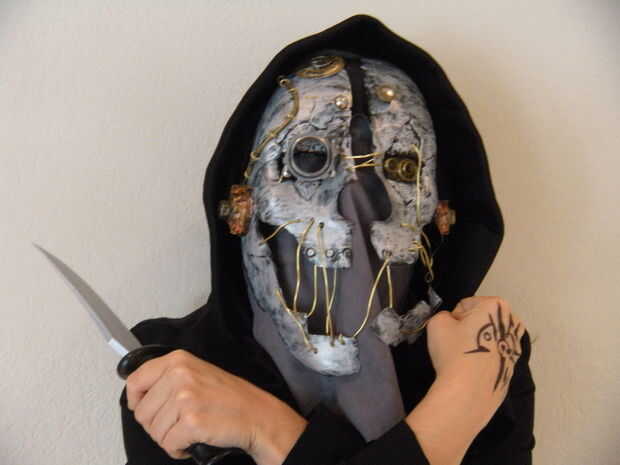 no recomienda utilizar esta mascarilla realmente ya que es bastante pesado y engorroso. Tenía un tiempo duro posando con ella en porque era tan pesado y mantenido resbalar por mi rostro. En cambio, puede ser utilizado como una decoración alrededor de la casa o incluso conectado al maniquí envuelto en un manto negro. O simplemente sentarse y ser espeluznante en su propio! (Tatuaje de Corvo no incluido)