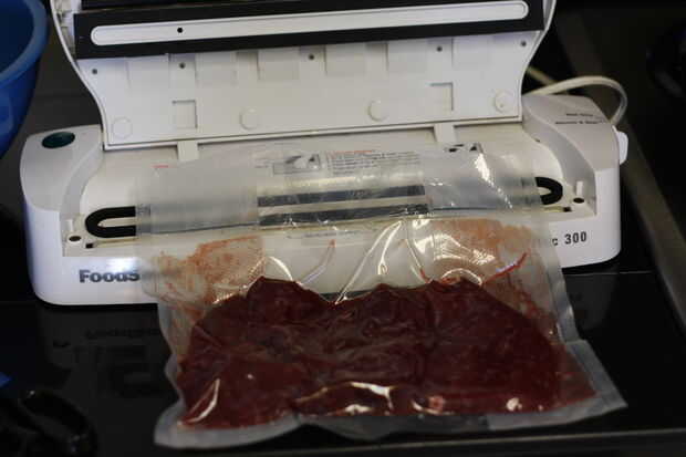 La carne sigue siendo fría y allí no es mucho líquido, así que usando un sellador de vacío tipo de canal no debería ser un problema. Ver el paso de equipo de Sous Vide de mi Sous Vide carne costillas Instructable para más información sobre el equipo.