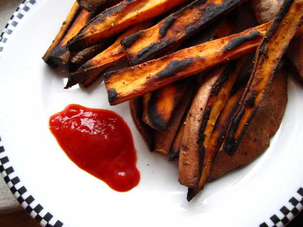 Sriracha y batata fritas. Preparación de tejido para una cama del perro, demasiado. :)