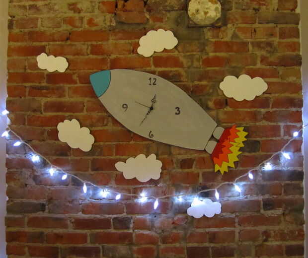 Reloj de nave espacial - hecho de cartón y de acrílico pintura. Realmente hizo ayer tarde por la noche en un capricho, pero desde que terminé después de la medianoche, la llamé buena.