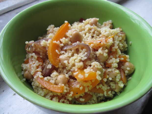 Almuerzo. Garbanzos, pimientos, cebolla, un chile thai y bulgur. A veces quiero comida feliz en los días tristes.