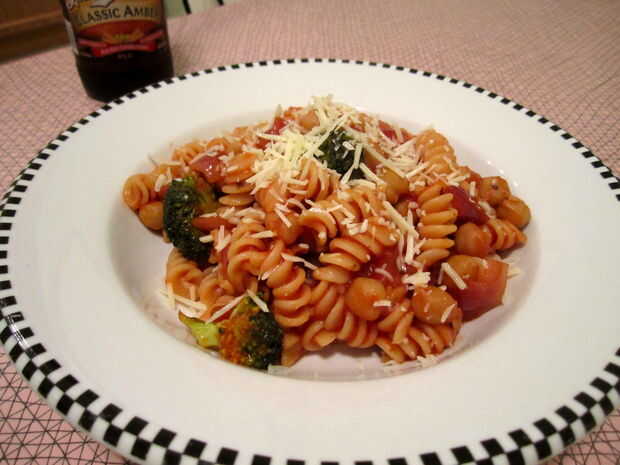 Cena. Pasta, garbanzos, una cebolla, tres dientes de ajo, brócoli, chile rojo, queso.