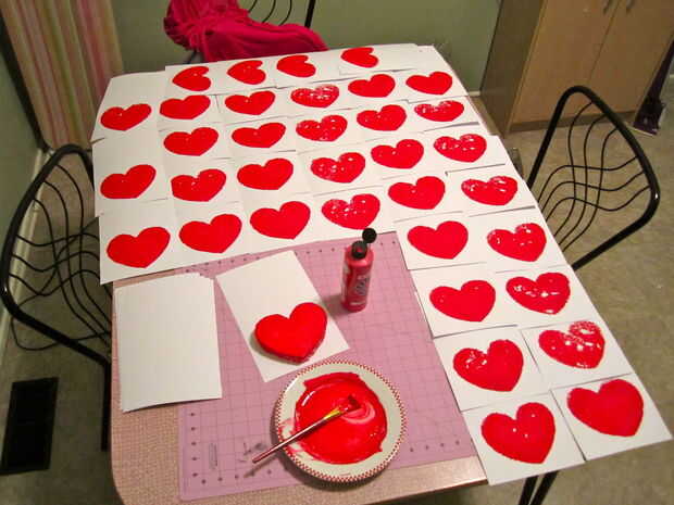 Mano imprime un montón de San Valentín en un bloque de espuma. Brazos doloridos.