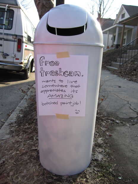 Intentó pintar un bote de basura, se dio cuenta de la pintura en aerosol para plástico apesta, hizo un gesto pegadizo.