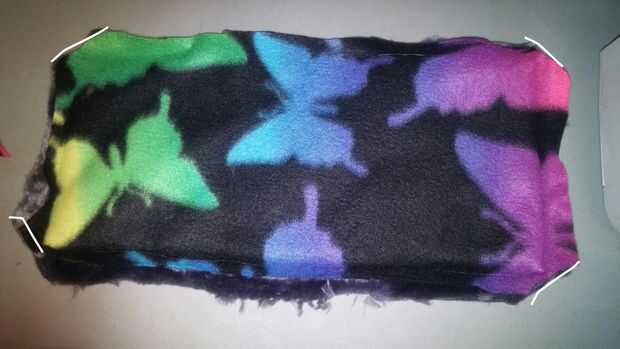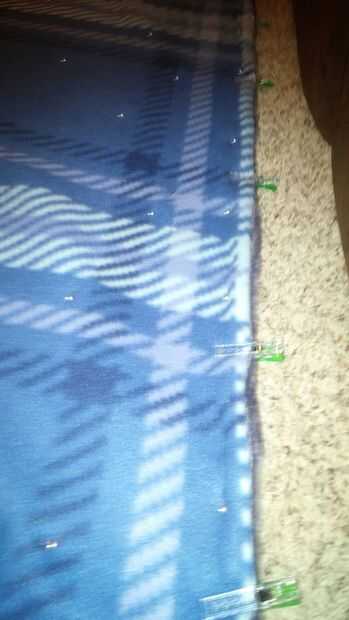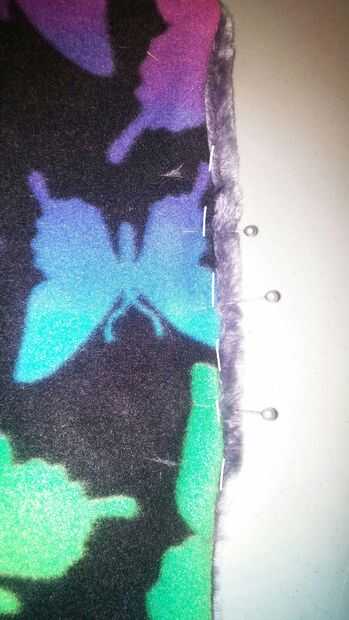 Establecer su manta fuera del lado de la piel, debe buscar su paño grueso y suave agradable e incluso. Esto fue lo que me lanzó a través del lazo. Comencé por suspirando las costuras planas y utilizando mis alfileres ramillete grande para anclar a dos tejidos juntos, ver fotos. Me din't quiero la tela moviendo sobre mí mientras estaba tratando de coser abajo.
