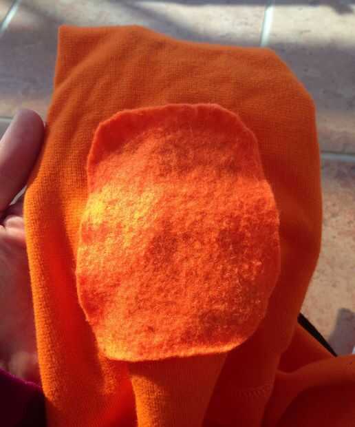 Usé un destripador de la costura para quitar rápidamente las letras grandes apliques en el frente, pero el logo en la manga estaba lleno de molesta bits poco más incómodas que habría tenido edad para eliminar, así que me rindo y caliente-pegar un trozo de fieltro naranja sobre él. Fácil y casi imperceptible - especialmente en la oscuridad. Me sorprendió gratamente.