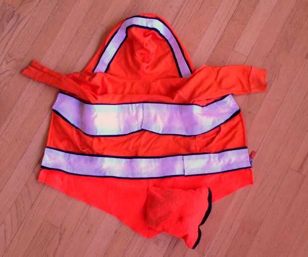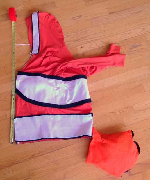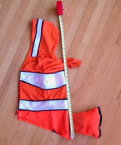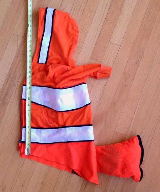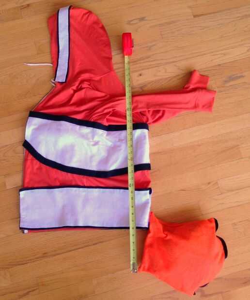 Para diseñar tus franjas, extienda su sudadera con capucha y tomar medidas. Aquí están la mina, para la referencia - estoy usando un adulto medio de Old Navy y un tamaño de niño 4 por Osh Kosh B'gosh. Si tienes toneladas de tiempo, prueba con maquetas de papel para asegurarse de que sus rayas se ven bien, luego transferir al fieltro. Estaba corto de tiempo, así que de alas. Seamos honestos: Si usted está buscando un no-coser el traje, seguramente vas a ser más corta en tiempo y volando demasiado. Así que comenzar con mis números y ajustar para caber.