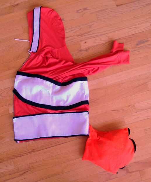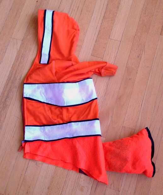 Dependiendo de cuánto tiempo usted tiene, modificar distancia. El traje adulto era que estábamos a punto de funcionar hacia fuera la puerta, así que aunque todavía tiene el borde negro de aleta (sí, que se hizo anteriormente), no hay ninguna pieza naranja adicional - sólo mano-viró la cola a la base de la capucha con un hilo y aguja. Me gusta mucho el look del traje con la pieza extra de fieltro naranja y da mucho mejor enganche puede utilizar pegamento caliente para todo. Yay la pereza.