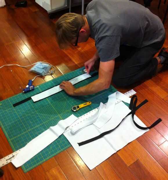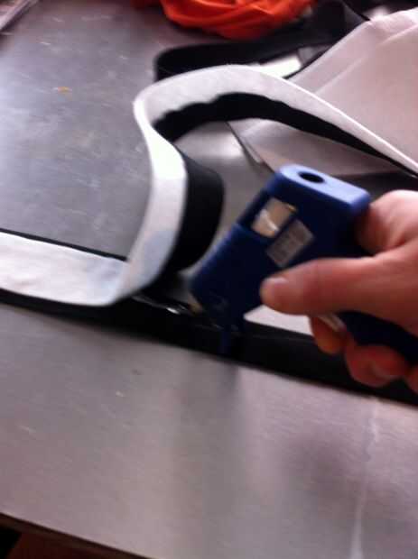 Aplique una tira de pegamento en las tiras de fieltro negro, luego presione el fieltro blanco sobre el negro, dejando la cantidad adecuada de bordes visibles. Usé 1/4" en la sudadera de mi hijo 1/2" sobre con capucha de adulto. YMMV.