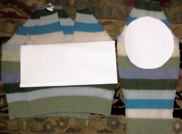 Ponga los pedazos de Jersey plano y decidan qué piezas serán lo suficientemente grande como para la cada pieza del patrón de papel. Se utilizará uno de los mangas, la parte delantera y la parte posterior de este suéter. La parte superior redondeada se coloca en la parte superior de la manga; y el rectángulo de 13 1/4 "X 6" es colocado en el frente y las secciones de espalda para arriba a través de la línea de axila a axila.