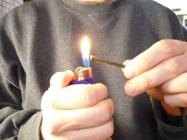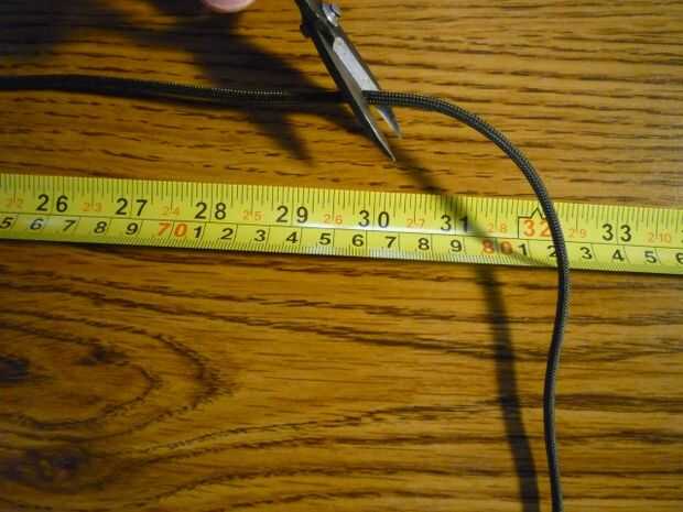 Desde el paracord, cortar dos tramos de 30 pulgadas y dividir el resto por la mitad. Debe tener dos piezas de 30 pulgadas, y dos que son unos 15-20 pies. Si vives en una zona con grandes árboles, ir a las longitudes más largas. Si usted está alrededor de los árboles pequeños (como yo), secciones de 15 pies va a estar bien. Selle los extremos de todas las piezas con un mechero o vela. Sellado de los extremos no es absolutamente necesario, pero que impiden que se deshilachen los extremos y hacer las cosas más ordenadas.
