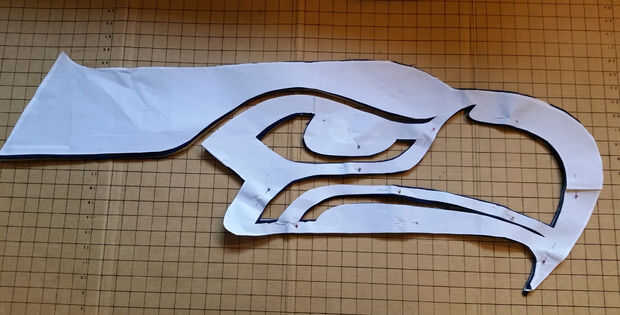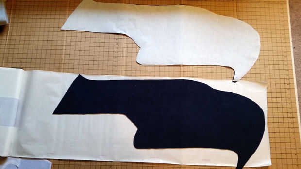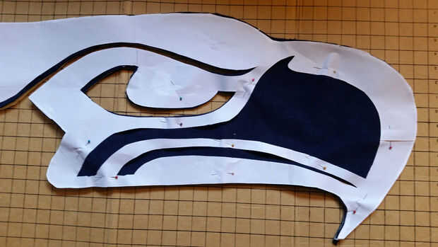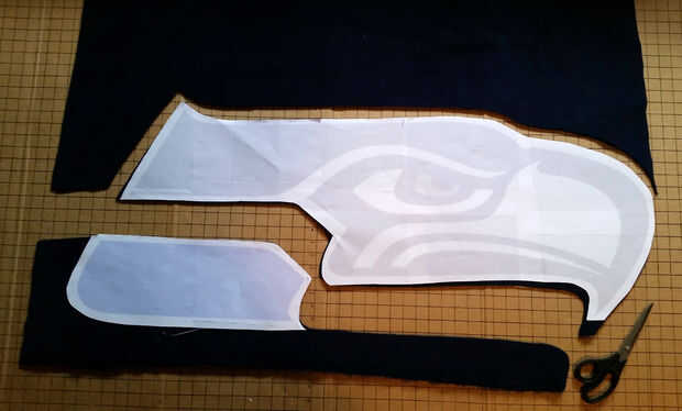 A continuación, fijó el patrón para que ambas capas del paño grueso y suave y cortar los detalles. Supongo que un cuchillo del Exacto o desmalezadora vendría práctico aquí pero no tengo uno disponible por lo que acababa de usar tijeras. En realidad, simplemente pintando el logo sería más fácil, pero apliques hacen más impresionante.