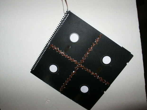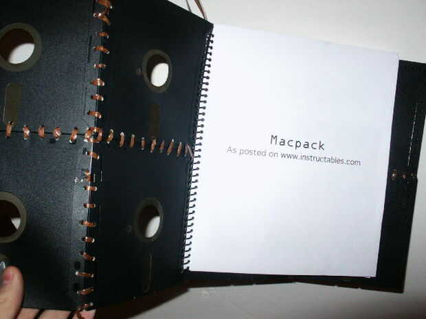 esto es una carpeta de floppy Disk de 5 1/4"(de la época del DOS 3.2.) Tengo mi Macpack y disquete bolsa en pantalla en una galería de arte y quería alguna manera presentar el instructables junto a las piezas, porque son parte del arte como las piezas ellos mismos. Suturan dieciséis discos en cuadrados de 2 x 2 y me tenia atado con el impreso dos carpetas para la presentación. Y fuera de nosotros:
