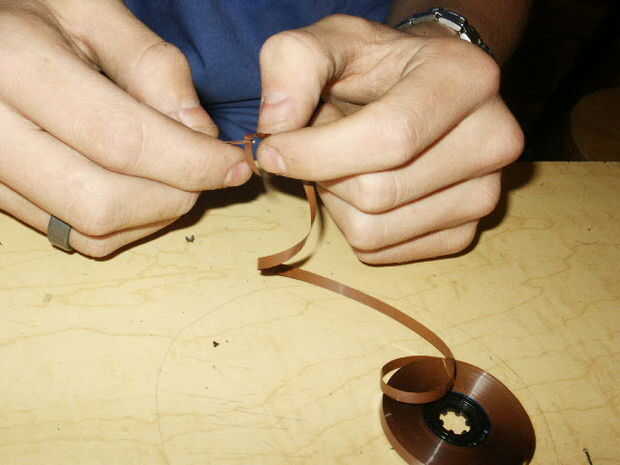 Enhebre la aguja con la cinta magnética (ayuda si cada vez que corte la cinta se corta en un ángulo) y comience a coser juntos los pedazos. Te recomiendo una simple puntada cruzada a las esquinas para mantener estable.