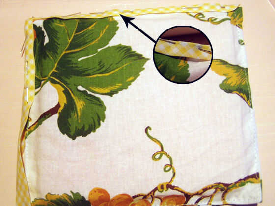 Piegate il nastrino una metà e mettetelo sul bordo en modo sia da un lato dall'altro ci sia la stessa quantità di nastro, fissate con gli spilli man mano procedete.