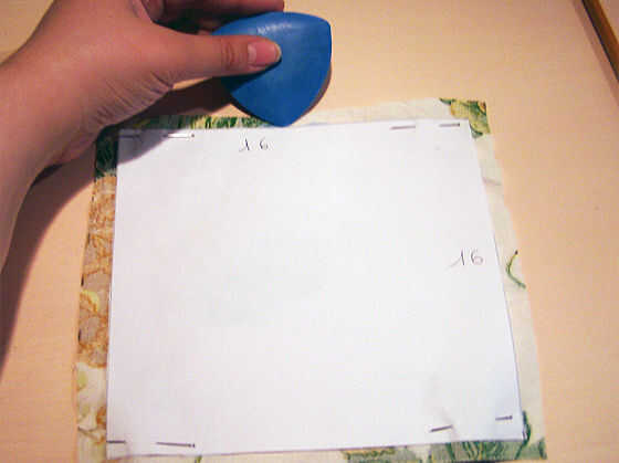Segnate con gesso de il i margini del quadrato poi togliete gli spilli e il quadrato.