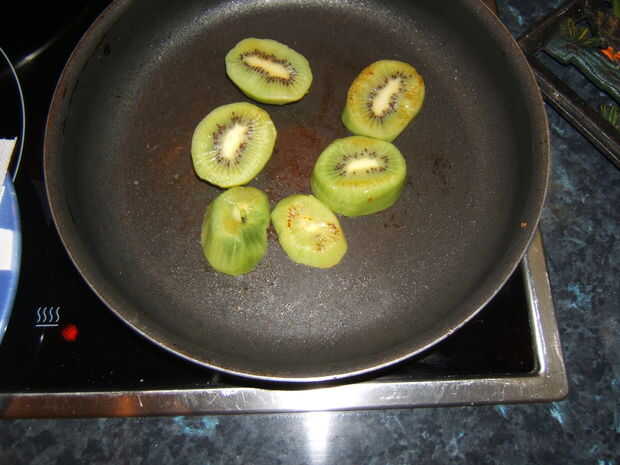 En la misma sartén o en otra uno, fríe los kiwis de minuite, o menos, withuot aceite, pero sólo hasta que tienen su color verde-TI significa que tienen su sabor.