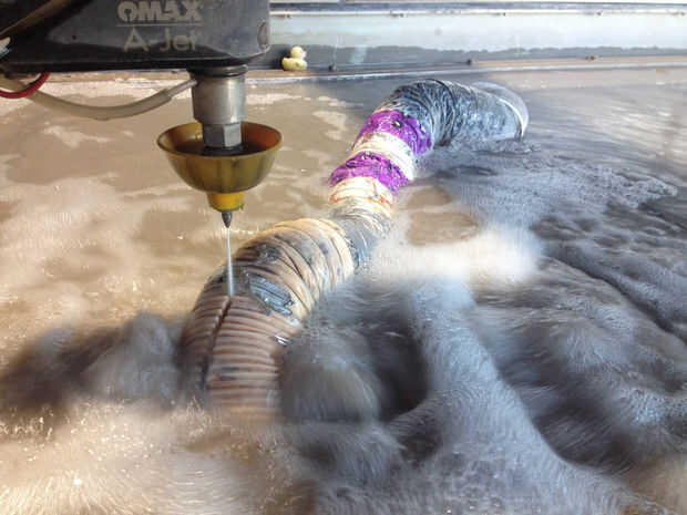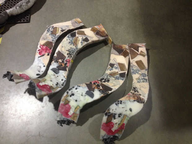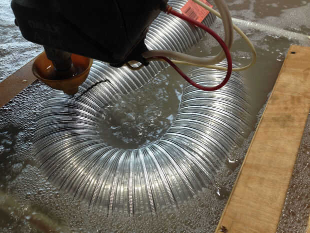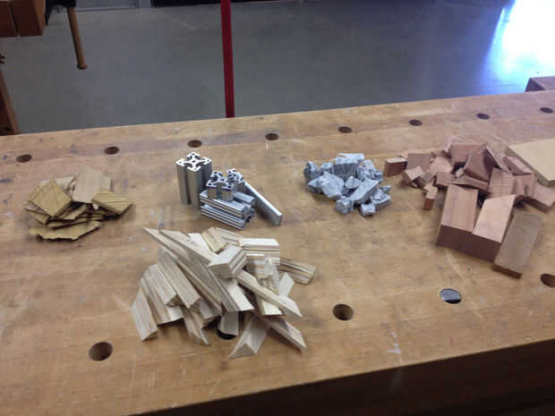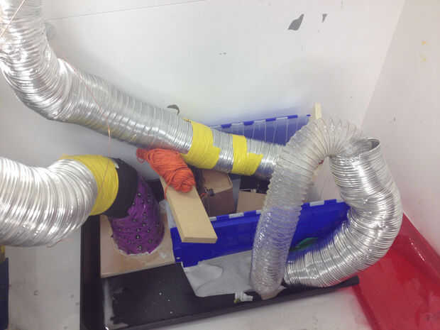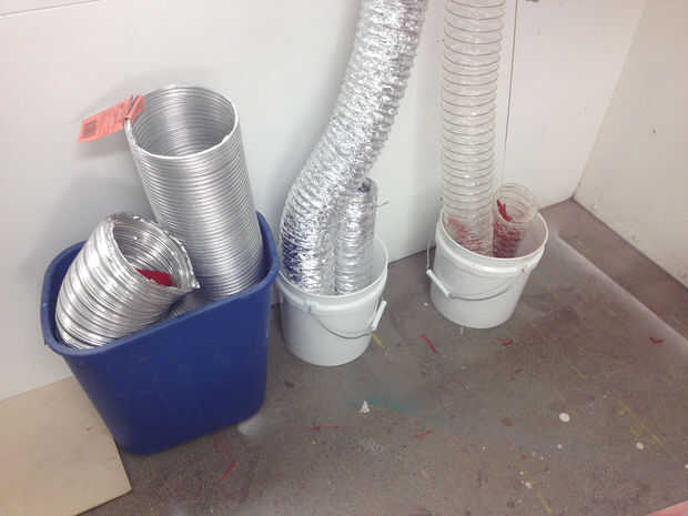 Después de hacer mi pieza cilindro geométrico, decidí desafiarme a mí mismo por el bastidor en un cilindro distorsionado, o en un tubo que cambia de dirección varias veces. La parte difícil era encontrar un material que puede soportar el calor de altos volúmenes de resina, permanecer estancos y quitar fácilmente de la fundición luego. Estos tres criterios me ayudó a resolver en conductos de ventilación. Establecer ensayos en pequeña escala con conductos de aluminio prensado, limpiar conductos de plástico (para temperaturas de hasta 250 grados centígrados) y conducto forrado con el plástico de la hoja. De estos tres ensayos, llené los moldes con materiales pétreos lavada de los cubos de la basura en el muelle 9: piezas de madera que cortar y pintado con colores múltiples, rompe rocas, descartan corte tela, acrílico y aluminio cortes láser. Todos los materiales de bastidor tres funcionaron bien: sin fugas, quitados algo fácilmente desde el casting y no hay problemas debido al calor. Me gustó la película de plástico transparente y prensado de aluminio mejor, así que decidí trabajar con éstas a mayor escala para mi proyecto final.