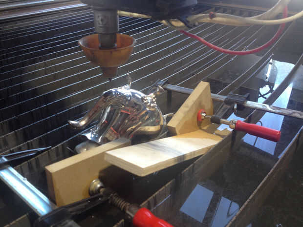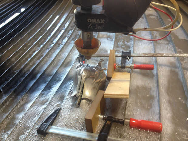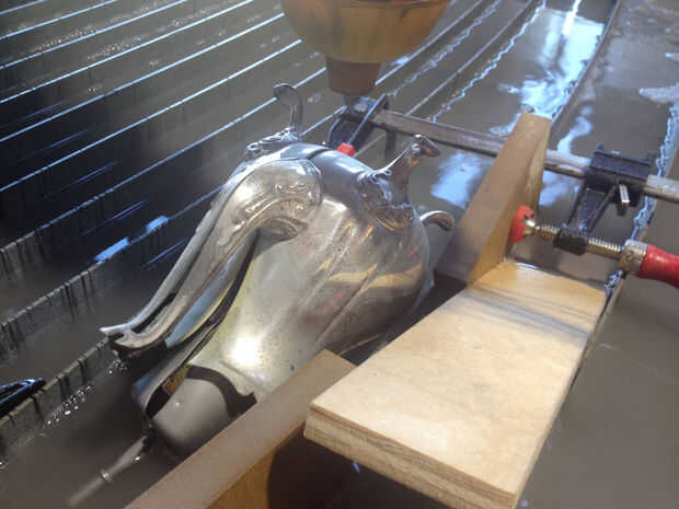El siguiente paso fue intervenir a objetos encontrados echando en su interior. Usé dos teteras doradas como mis moldes y los llenó con gafas, tubo para autopartes, tornillos, filtros de gasolina, papel arrugado y aluminio chatarra mecanizado de goma. Entonces llené el resto del espacio con resina epoxi transparente, deje que las piezas de la curación por 72 horas y configurar en la herramienta de corte por chorro de agua. Me di cuenta que podía apretar las teteras entre dos listones de la cama de la máquina y sujetarlos lateralmente con las abrazaderas en C. La tensión en los listones de metal trabajado a mi favor, apretando las dos partes juntas como la cut hacían así que ni la mitad caería hacia abajo más tarde.
