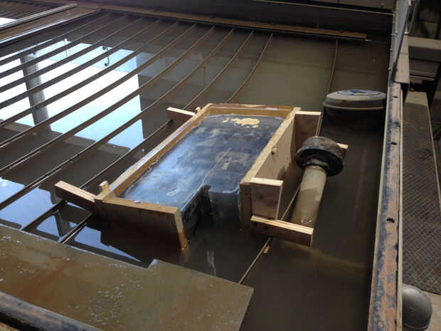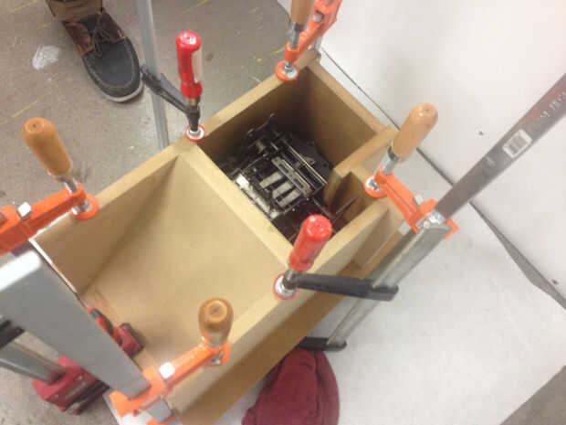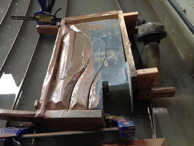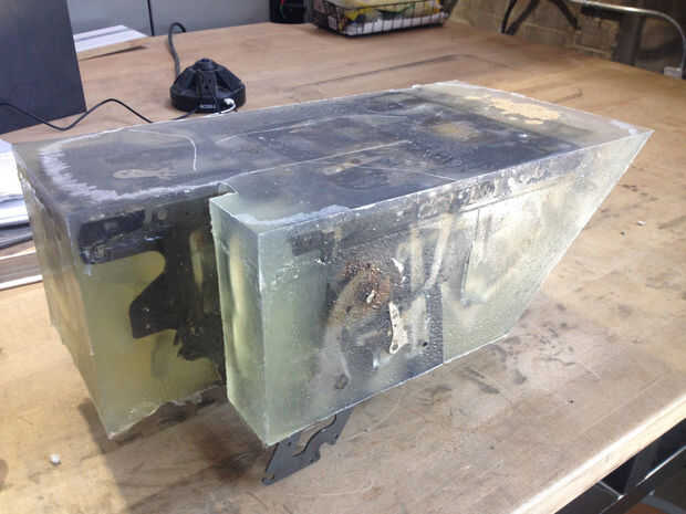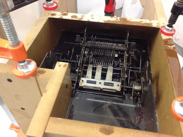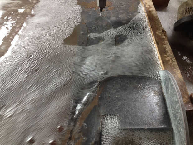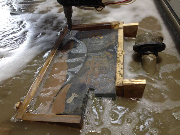 Mi amigo encontró una máquina sumadora en un almacén en el estado de Nueva York y envió todo el país por lo que podía hacer frente a su destino a manos de la corte por chorro de agua. Construí un molde simple para con MDF y encapsulado en resina transparente de epoxy en la cavidad para congelar las piezas móviles y convertir el objeto en una masa sólida. Entonces utilicé este mismo molde como una plantilla para el corte por chorro de agua, añadiendo cuñas angulosas para conseguir el aspecto de un corte de 5 ejes con agradables curvas compuestas. Para este proyecto decidí hacer dos cortes paralelos para que yo pudiera tener una pieza interior separada. Quité los listones en el otro extremo del chorro de agua cama del corte para que pudiera bajar mi pieza en el agua, como el z puede sólo ir por encima de la parte superior de los listones unos 4.75". El derecho de cortar ha superado los límites suaves de la máquina, pero por suerte no extendió más allá de los límites duros por lo que no era necesario que volver a hacer mi sistema de fijación.