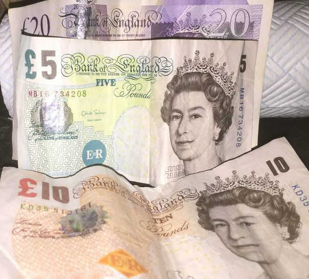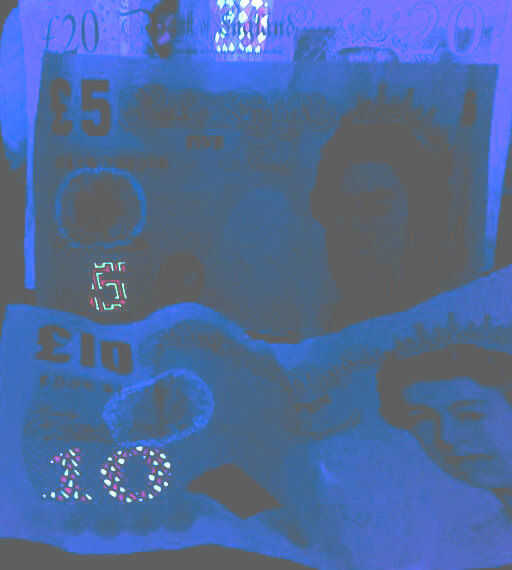 Billetes de banco del Reino Unido cuentan con la denominación impresa en tinta fluorescente. Brillan con un vibrante amarillo y rojo bajo luz UV.