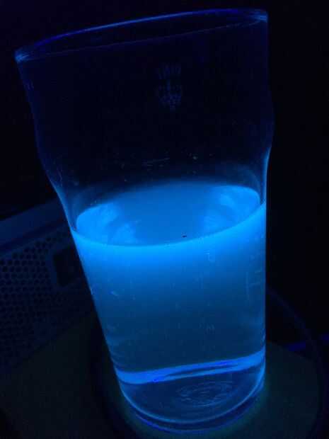 La izquierda es un vaso de agua tónica contiene quinina. Originalmente utilizado por expatriados en el imperio británico como un medicamento para protegerse de la Malaria. Brilla intensamente azul.