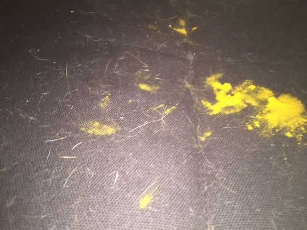 La imagen central muestra que cúrcuma derramado en una silla. También son visibles algunos trozos de blanca que brilla intensamente de pelusa.