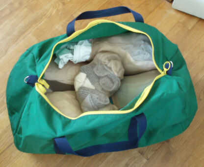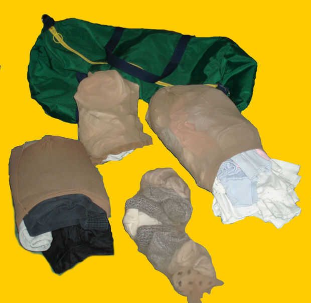 Finalmente probé esto al embalar para vivir fuera de una bolsa de viaje en un campamento/taller de cinco días. Nunca podrá empacar sin piernas y cuerpos otra vez! Pantalones, camisas, etc. encajan al menos parcialmente en los cuerpos. Calcetines, ropa interior u objetos pequeños que caben en las piernas. No nuevas arrugas Haz agregadas (una vez rellenas, las cosas tienden a no moverse), y todo es fácil de encontrar - incluso en el cuarto día. Añadir una bolsa de lavandería para ropa sucia, y listo para ir.