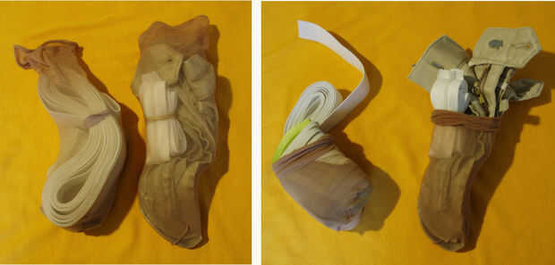 Longitudes de las piernas con un nudo en un extremo hacen gran almacenamiento para cosas extrañamente formadas que normalmente en una bolsa de plástico. Pero las bolsas de plástico son voluminosos y ruidosos y no respiran bien. Guardando cosas en longitudes de piernas (dependiendo de su estilo de medias) te permite ver lo que está dentro, y ampliar o contrato para caber la forma de lo que tienen.