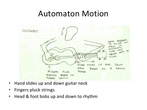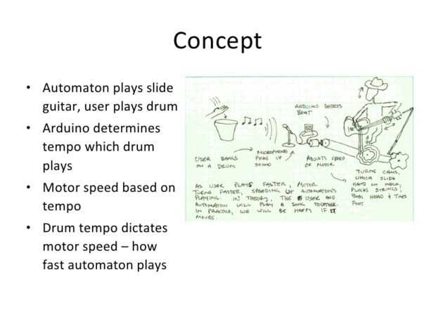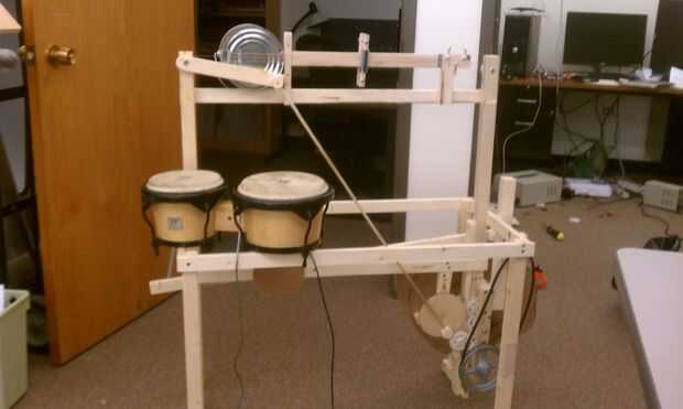 busca baterista es un autómata tocando guitarra slide que jugará siempre y cuando alguien toca la batería para él, diseñado y construido para el curso de otoño 2012 cosas que creo que enseñó en la Universidad de Colorado - Boulder. Hay dos principales mecanismos de control de los movimientos, uno para el brazo de rasgueos y otro para mover la diapositiva. Éstos son ambos conducidos desde el mismo motor de DC de diferentes puntos de una caja de engranajes. La entrada se toma de un tambor de mano con un micrófono piezoeléctrico colocado y enviado a un Arduino.