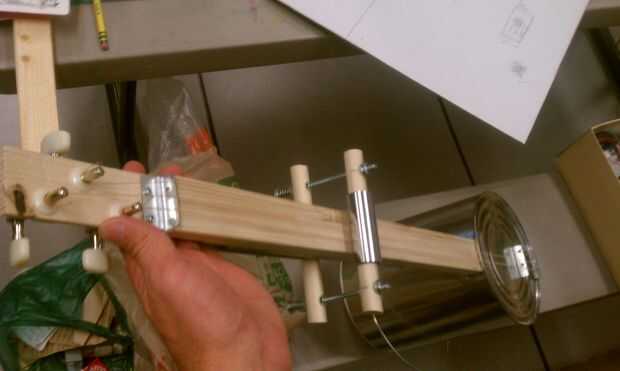 Se cortan dos pequeños agujeros en lados opuestos de la lata de pintura lo más cerca del fondo posible. Esto es donde la 1 "x 2" diapositiva en. Algunos tornillos para madera tienen en el lugar a través de la parte inferior de la pintura puede. La tuerca y el puente se puede hacer cualquier número de maneras, ver la Web de guitarra caja de cigarro de ideas. Metal, las placas que fueron cortadas y dobladas a 90 grados en un vicio. Una técnica similar fue utilizada para la silla que sostiene las cuerdas en su lugar en el final de la guitarra.